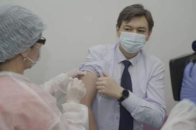 哈萨克斯坦首席卫生医师、卫生部副部长叶尔兰·基亚索夫和卫生部副部长阿扎尔·吉尼亚特2月1日早晨在首都努尔苏丹市立第6医院完成了新冠疫苗第一针的注射接种。