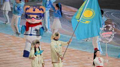 运动员入场仪式持续约50分钟,哈萨克斯坦代表团第12个入场。冰球运动员阿德勒·别凯塔耶夫与短道速滑选手奥尔加·季霍诺娃共同担任旗手,率领哈萨克斯坦队步入主会场。