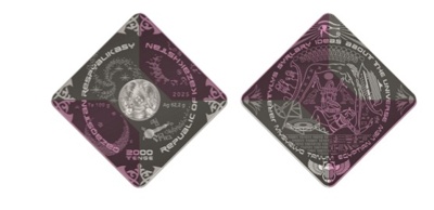 MYSYRLYQ TANYM 纪念币的设计将古埃及意象与现代世界观相结合。纪念币的钽质部分呈现埃及神祇形象,而银质部分则刻画了技术符号及其演化脉络。