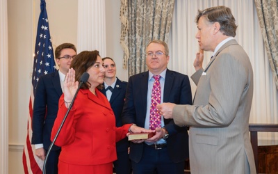 美国常务副国务卿克里斯托弗·兰多(Christopher Landau)主持宣誓仪式,哈萨克斯坦驻美国大使马赫詹·伊利亚索夫和朱莉·斯塔夫特家属出席。