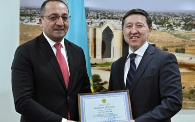 会见结束时,阿尔曼·伊塞托夫代表哈萨克斯坦外交部长叶尔梅克·阔谢尔巴耶夫,向大使颁授荣誉证书,以感谢其为推动哈瑞关系发展作出的贡献。