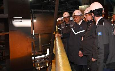 托卡耶夫总统在企业负责人——Qarmet股份公司董事会主席安德烈·拉夫连季耶夫和总经理瓦迪姆·巴辛——的带领下,参观了该企业3号高炉等设施,并听取了关于企业发展方面的汇报。