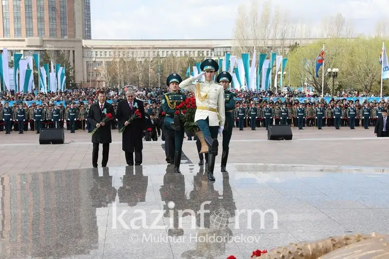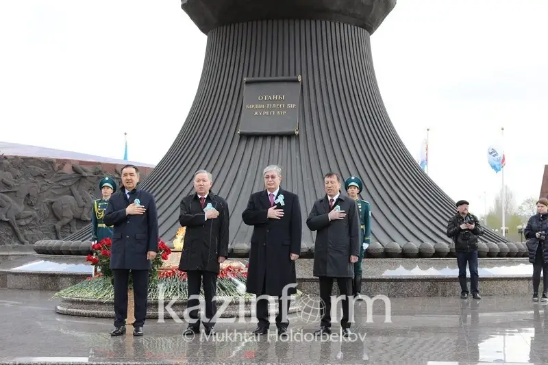 总统办公厅主任阿德里别克•贾克斯别克夫、政府总理巴赫特詹·萨金塔耶夫、马吉利斯(议会下院)议长努尔兰·尼格马图林和参议院(议会上院)议长哈斯穆卓玛尔特·托卡耶夫出席了献花仪式。